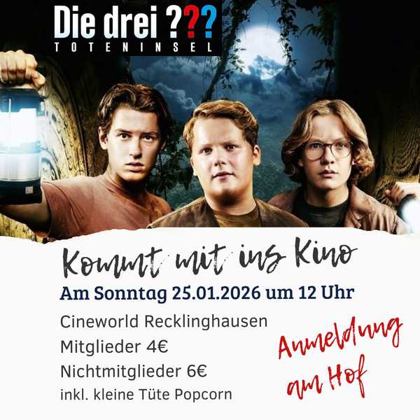 Am 25.01.2026 konnten 120 Mitglieder mit Familie und Freunden die drei Detektive zur Toteninsel begleiten. Mit der Tüte Popcorn in der Hand, die vom Jugendvorstand gesponsort wurde, erlebten wir einen spannenden Sonntag mittag im eigenen Kinosaal im Cineworld Recklighausen.